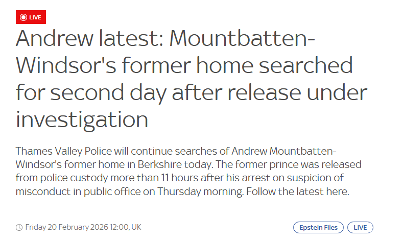 Taktéž je zde zmíněn člen Britské Královské Rodiny - Princ Andrew Mountbatten, který byl tento čtvrtek v ranních hodinách zadržen policií.
