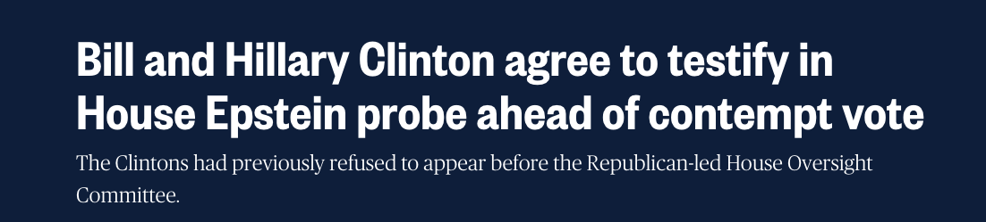 Což bychom konečně mohli začít vidět, protože Bill Gates je předvolán, aby před Kongresem vypovídal o Epsteinovi, stejně jako Bill Clinton a Hillary Clintonová, kteří již byli obviněni z pohrdání soudem, protože neregovali na tuto výzvu.