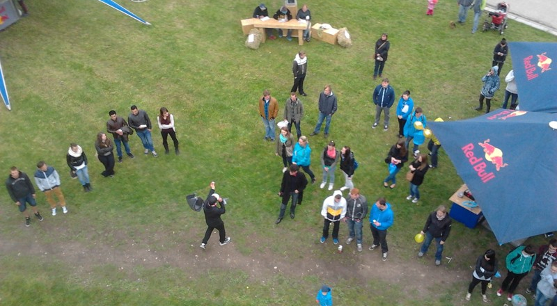 Je psí počasí – dají nám to za účast. To byl velký omyl. Navzdory počasí se přihlásilo 14 týmů a tvořily úžasné vynálezy. Museli jsme zaimprovizovat a na místě náš fyzikálně dokonalý stroj zestetičnit. V průběhu soutěže do nás pod tlakem byly tlačeny sycené povzbuzující nápoje. Hurá na plošinu a vzhůru do mraků. Plošina převyšovala knihovnu a vítr s ní lomcoval. 3–2–1-start, náš zárodek se řítil k zemi rychlostí v=(g*t)-x, kde proměnná x byla více méně v naší režii. Zpočátku se zdálo, že jsme to podcenili, jelikož čas dopadu byl krátký t=2,8s, ale tlumící špagetové zařízení zafungovalo. Špagety pohltily přebytečnou kinetickou energii, která způsobila jejich destrukci. Moderátor hlásí: Vajíčko žije a plošina klesá dolů.